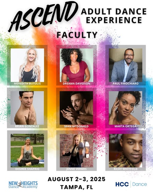 ASCEND Adult Dance Experience Two days of growth, community, and incredible classes tailored just for adult dancers 30 years old and above who love to dance. This event is brought to you by New Heights Dance Academy and co-sponsored by Hillsborough Community College Dance Department. Let’s move, connect, and ASCEND together. Register Early. Spots are filling up. Full bios and more info at newheightsdancetampa.com/ascend