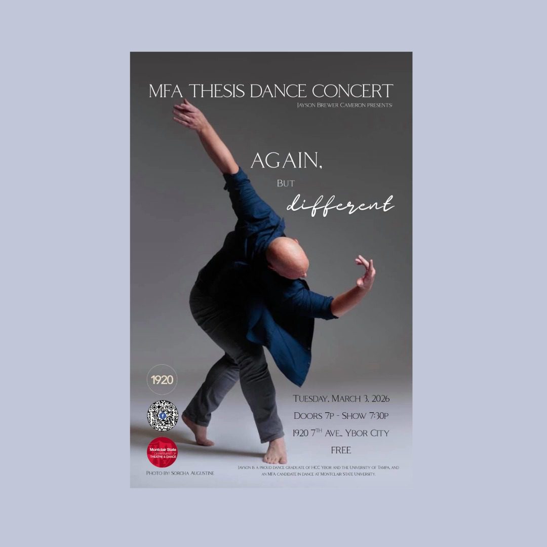Jason Brewer Cameron presents: MFA Thesis Dance Concert Again, But Different Tuesday, March 3, 2026 “1920″ in Ybor City 1920 7th Ave Ybor City, Tampa 33604 Doors open at 7:00 PM and the show starts at 7:30 PM. Come early to hang out, catch up, and grab a drink. Can’t wait to see you there!! To RSVP and find more information: https://www.facebook.com/share/1BimrLwWvA/